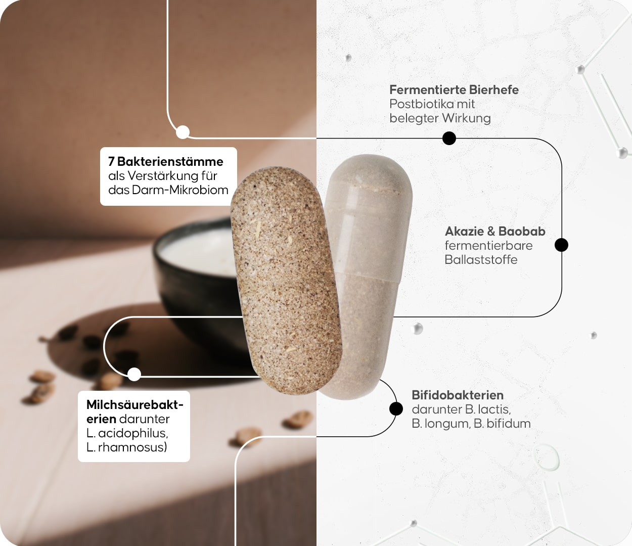 Zutaten Kapsel (SCIENCE): Fermentiertes Bierhefepulver (EpiCor®), präbiotische Mischung aus Baobabfruchtpulver und Akazienfaser (INAVEATM), B-Vitamine aus Quinoasprossen (Panmol®), Kapselhülle (Überzugsmittel (Hydroxypropylmethylcellulose), Probiotischer Komplex (LAB2PRO®)): Streptococcus thermophilus; Lactobacillus acidophilus; Lactobacillus rhamnosus; Bifidobacterium lactis; Bifidobacterium longum; Bifidobacterium breve; Bifidobacterium bifidum.